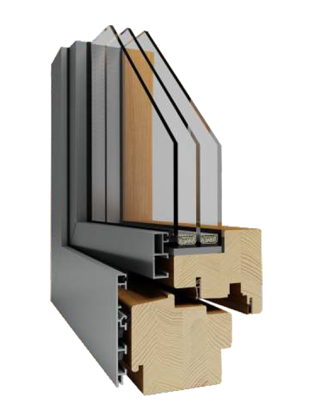 | Konstruktion: | Holz-Aluminium Profil Duo Modern AC Holzrahmenstärke 68 mm + 18,5 mm Aluminiumprofil von der Fassadenseite Beliebige Form und Grösse des Fensters |